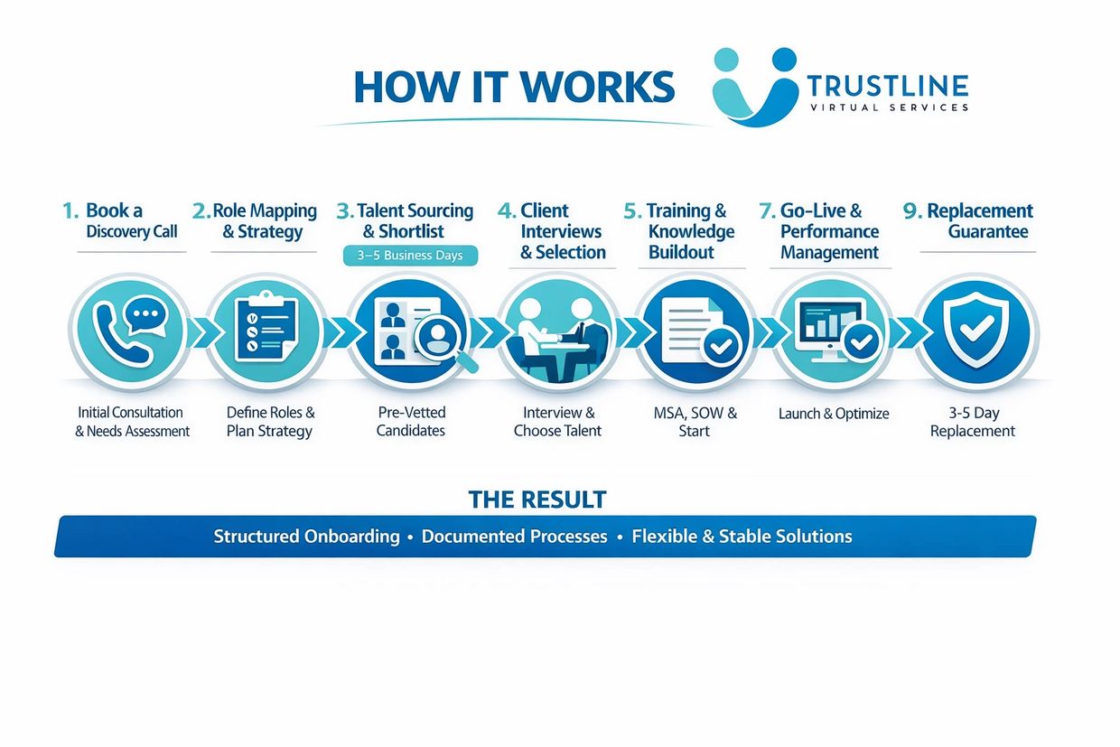 It starts with a no-pressure discovery call. You tell us about your business, your challenges, your goals, and what kind of support you need. We ask the right questions to fully understand your workflow and expectations.